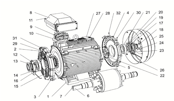 ?1定子機(jī)座 2端蓋(D端) 3端蓋螺釘(D端) 4端蓋(N端) 5端蓋螺釘(N端) 6帶軸轉(zhuǎn)子 7鍵(D端) 8接線盒 9接線板 10中間法蘭 11接線盒蓋螺釘 12軸承外蓋(D端) 13帶迷宮式密封件的D端......【點(diǎn)擊詳情】